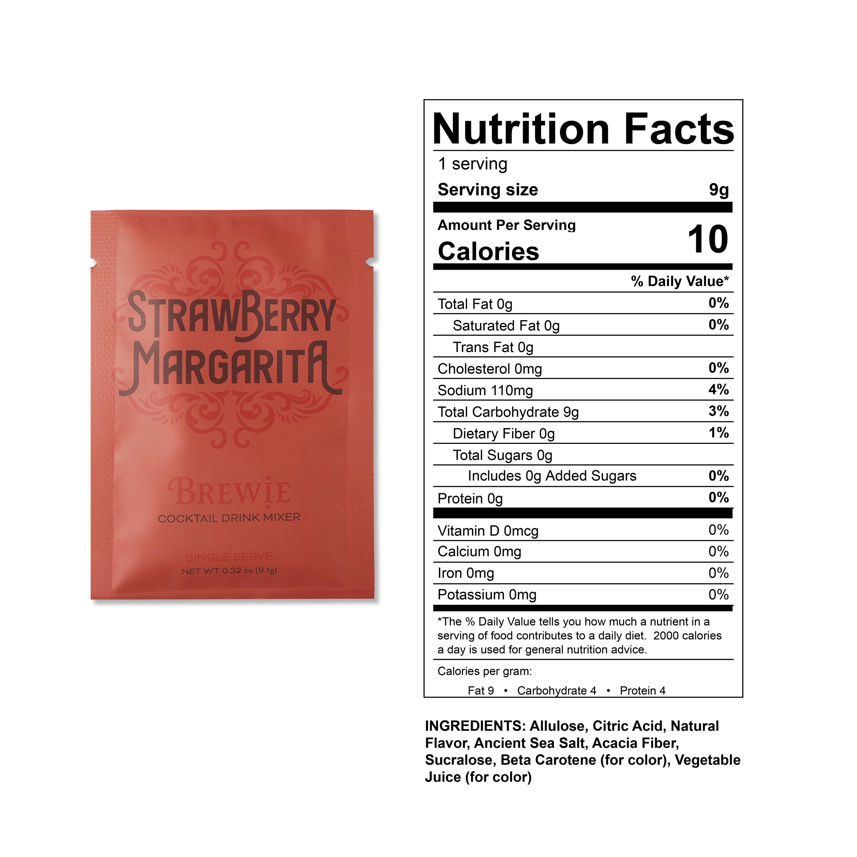 | Strawberry Margarita | Allulose, Citric Acid, Natural Flavor, Ancient Sea Salt, Acacia Fiber, Sucralose, Beta Carotene (for color), Vegetable Juice (for color) |