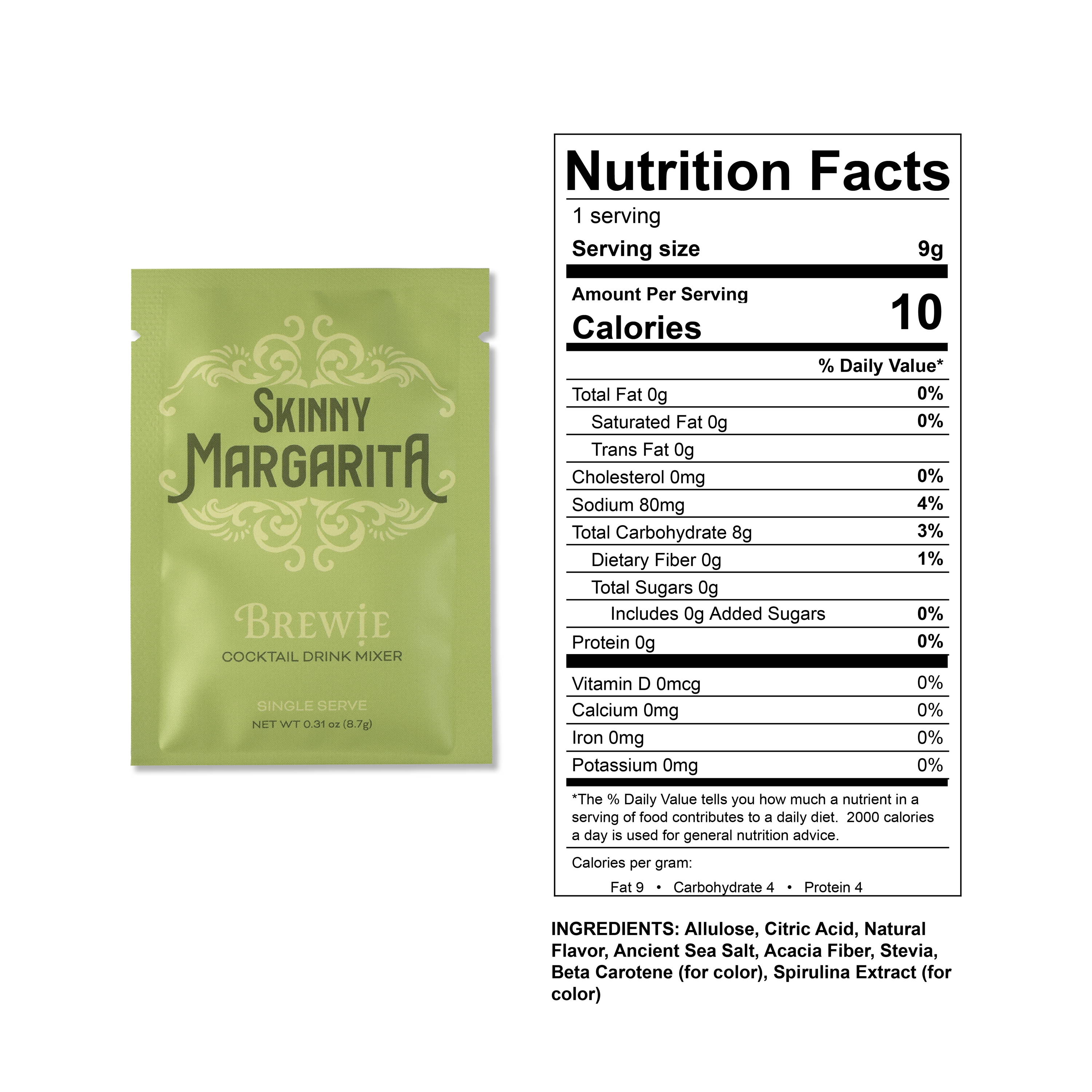 | Skinny Margarita | Allulose, Citric Acid, Natural Flavor, Ancient Sea Salt, Acacia Fiber, Stevia, Beta Carotene (for color), Spirulina Extract (for color) |