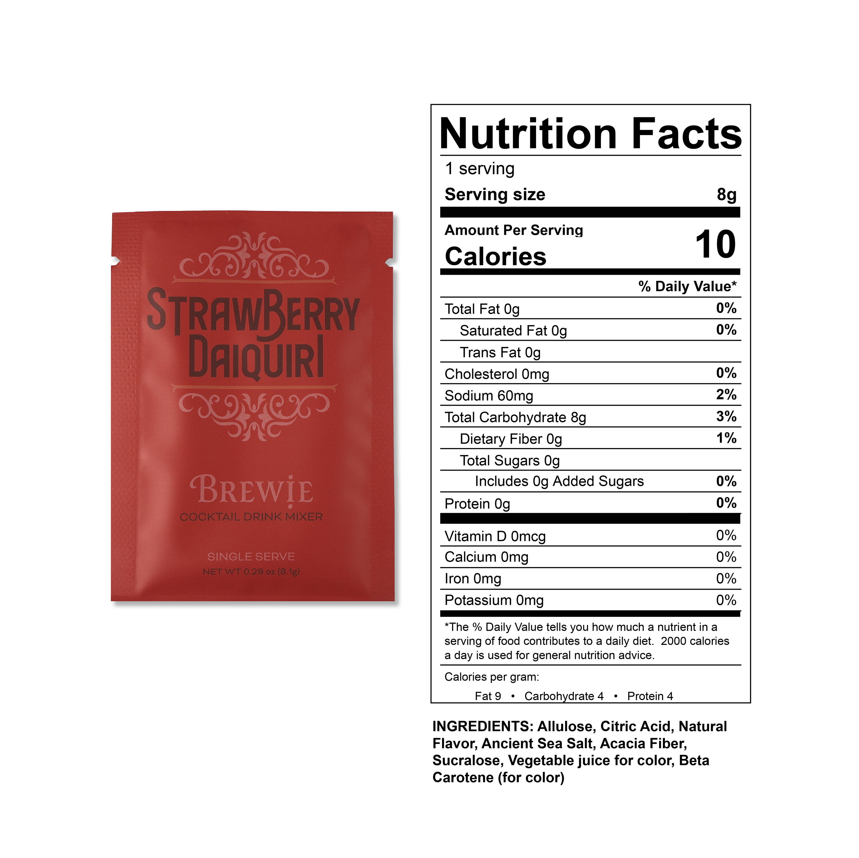 | Strawberry Daiquiri | Allulose, Citric Acid, Natural Flavor, Ancient Sea Salt, Acacia Fiber, Sucralose, Vegetable juice for color, Beta Carotene (for color) |