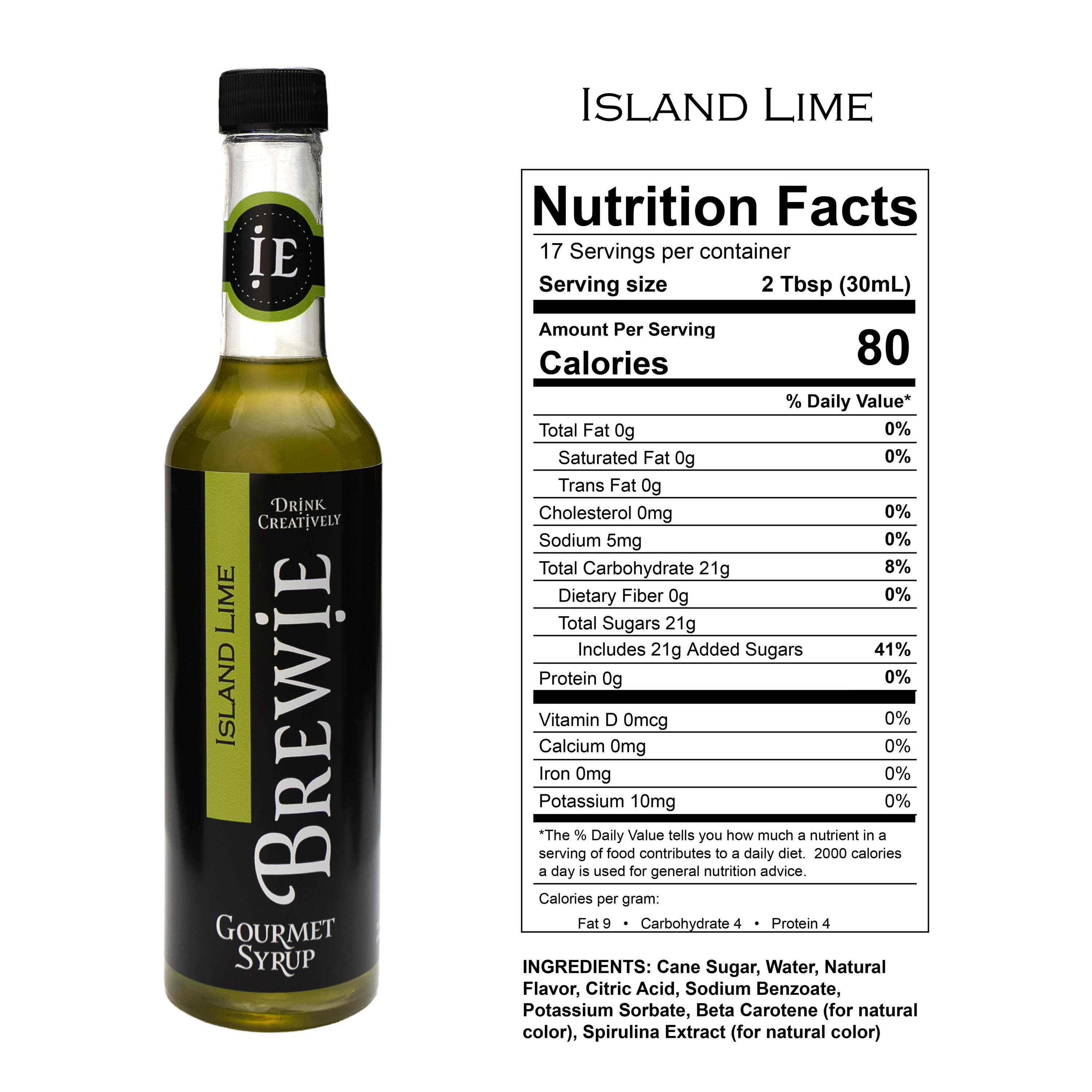 | Island Lime | Cane Sugar, Water, Natural Flavor, Citric Acid, Sodium Benzoate, Potassium Sorbate, Beta Carotene (for natural color), Spirulina Extract (for natural color) |